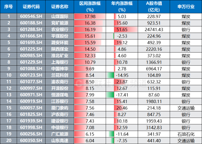 具体个股方面,同样以近8日行情统计,累计共有8只红利指数成分股涨幅超10%,分别为山煤国际、兖矿能源、农业银行、平煤股份、潞安环能、陕西煤业、淮北矿业、上海银行,中国神华、兰花科创、渝农商行、开滦股份、恒源煤电、江苏银行、厦门象屿等股也涨幅居前,而立霸股份、南钢股份、中谷物流、中南传媒4股则于近日收跌,但跌幅均未超3%。