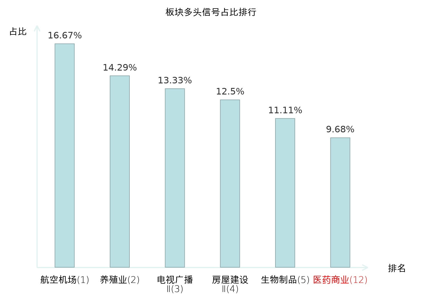全市场所有行业板块中主力多头信号占比排名中,航空机场板块位居第一。航空机场板块名次提升最快,较昨日上升113位。