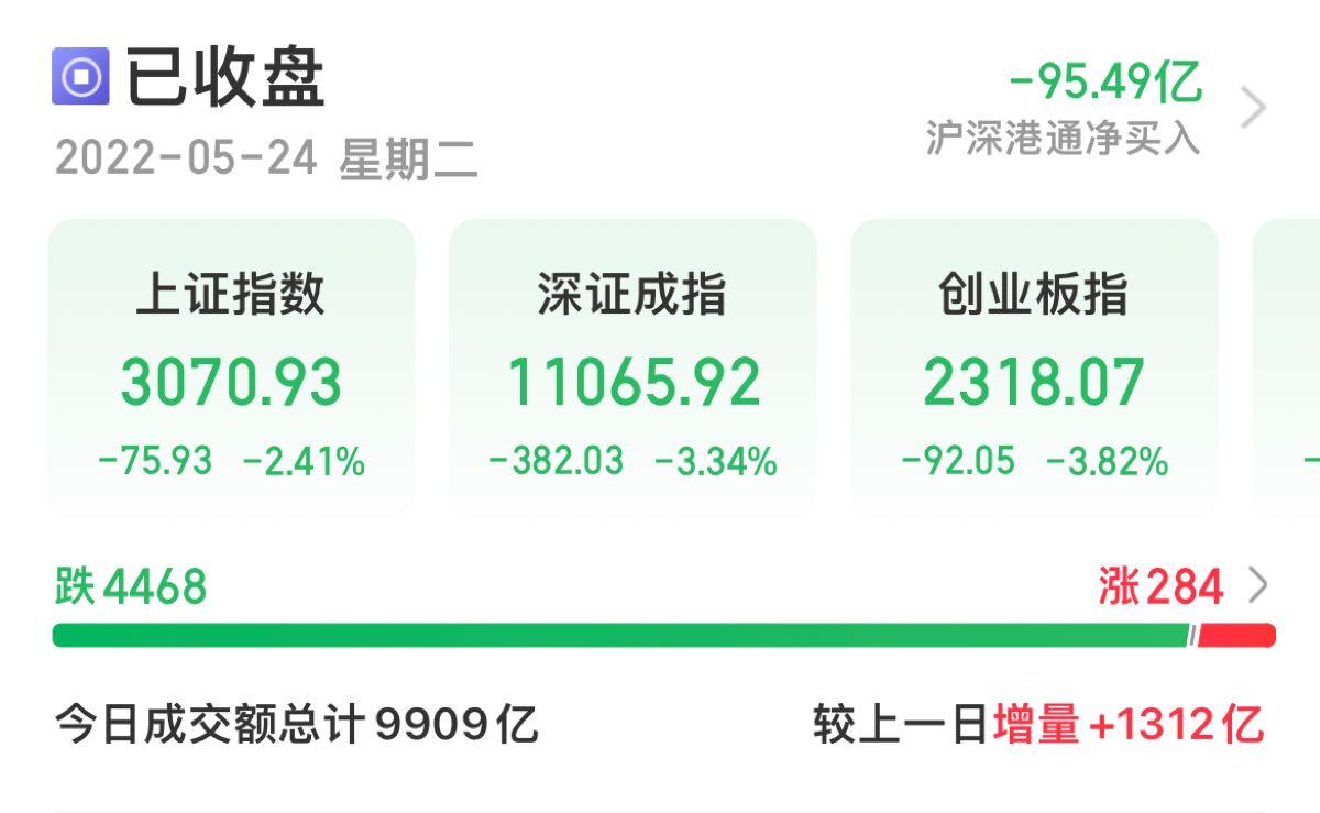 三大指数午后集体下挫,沪指再度失守3100点,截至收盘,沪指跌2.41%,深成指跌3.34%,创业板指跌3.82%。两市所有概念板块无一上涨,亏钱效应爆棚,新冠治疗、互联网电商全天领跌。两市超4400只个股下跌,上涨家数仅200余家。两市全天成交额9909亿元;北向资金狂卖近百亿元。