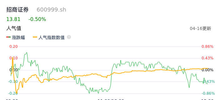 04月16日,招商证券收报13.81,股价涨幅-0.50%,成交金额2.16亿元,换手率0.21%。