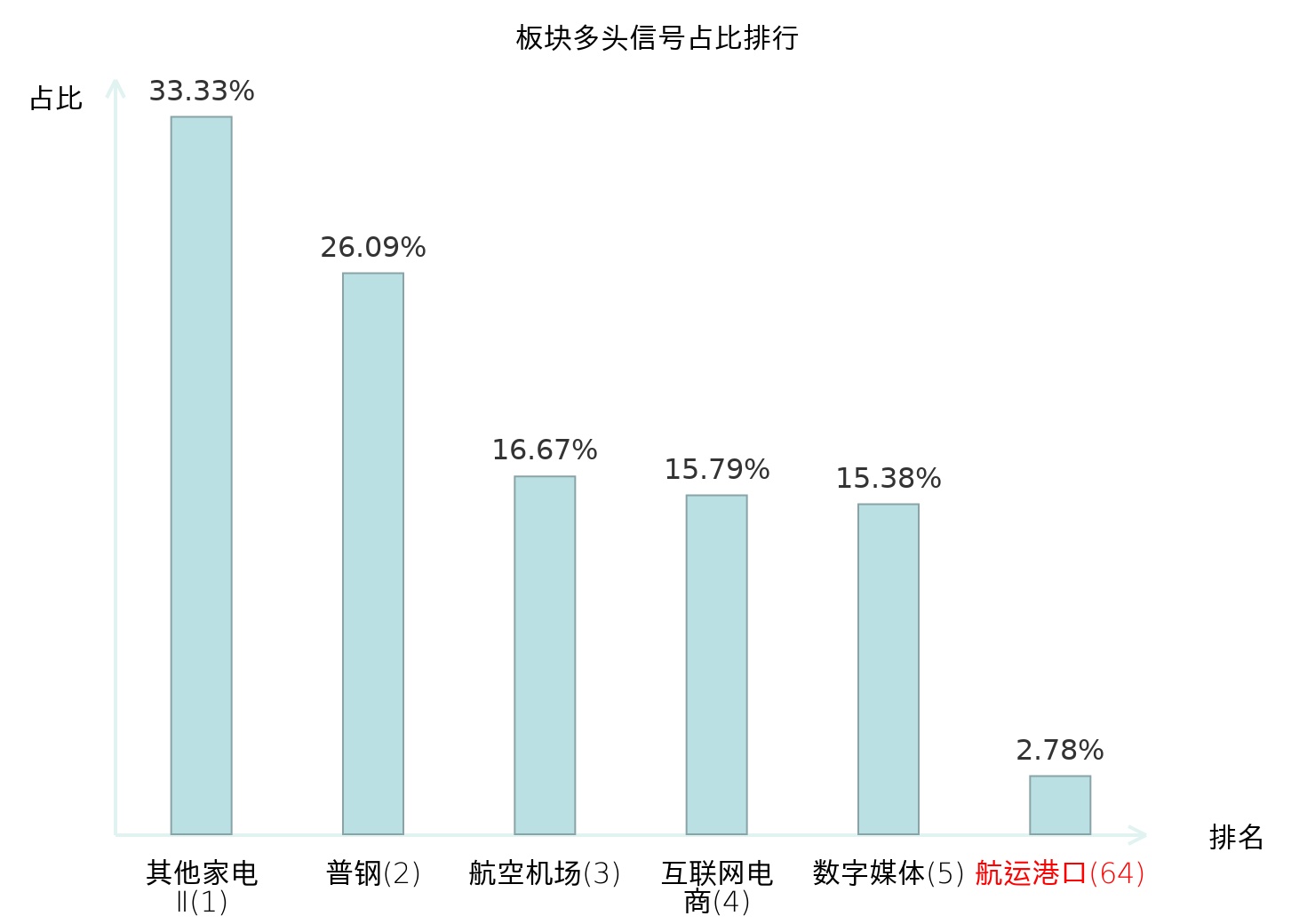 全市场所有行业板块中主力多头信号占比排名中,其他家电Ⅱ板块位居第一。其他家电Ⅱ板块名次提升最快,较昨日上升129位。