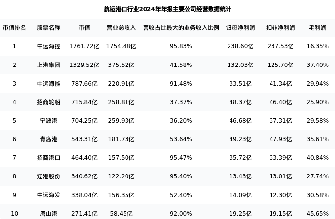 唐山港最新报告期数据为年报,下表汇总了航运港口行业内市值靠前的公司年报主要经营数据