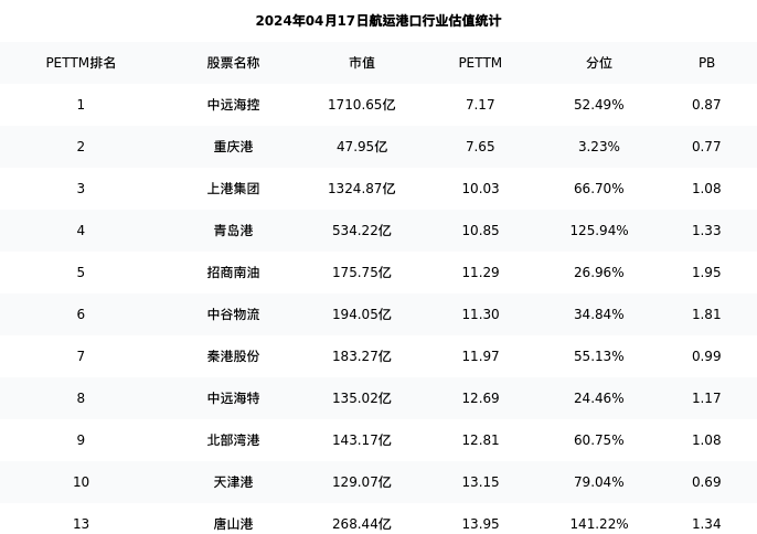 从估值角度看:唐山港最新市盈率PETTM为13.95,在行业内排名13/34,处于141.22分位。