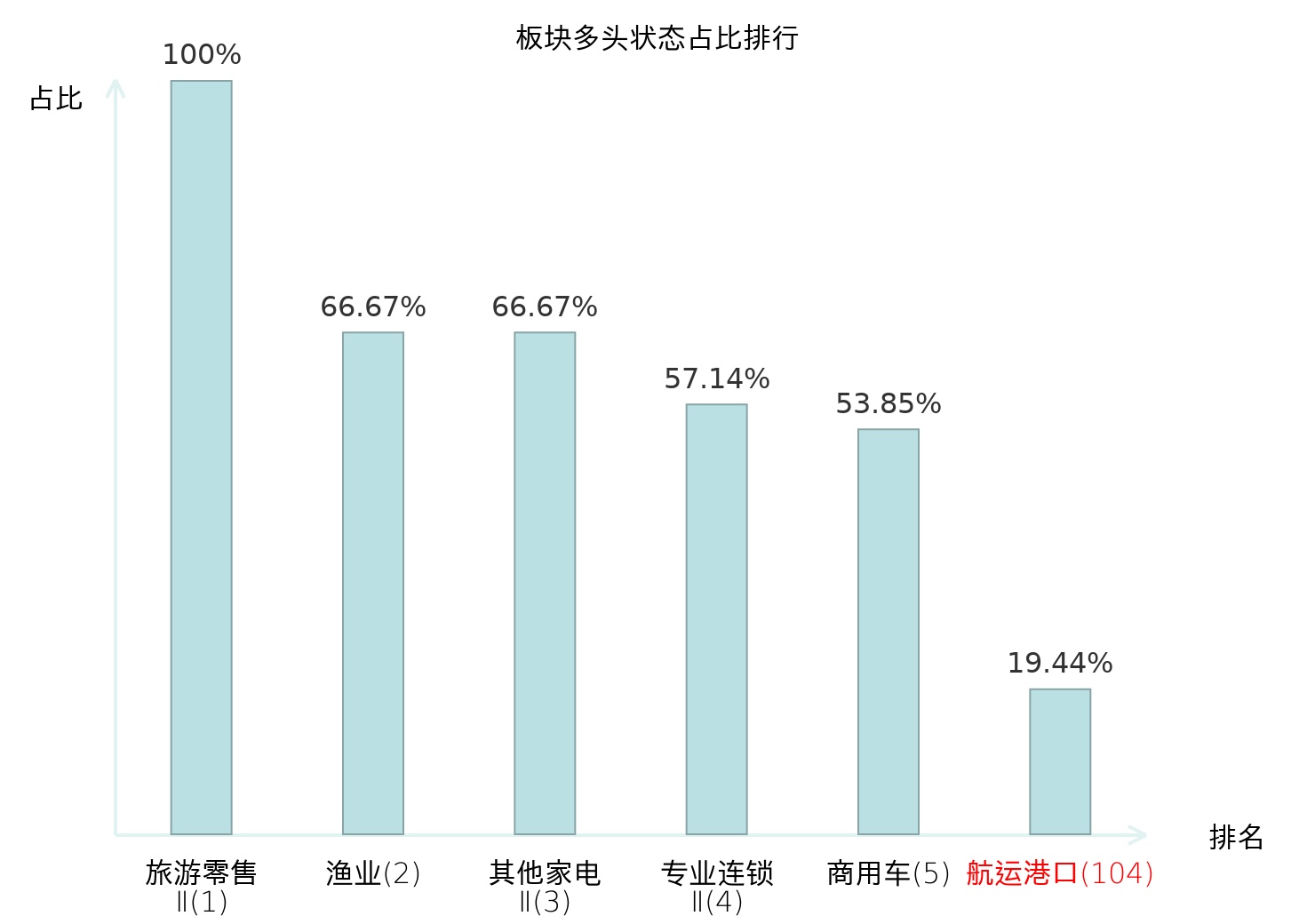 全市场所有行业板块中主力多头状态占比排名中,旅游零售Ⅱ板块位居第一。农产品加工板块名次提升最快,较昨日上升46位。