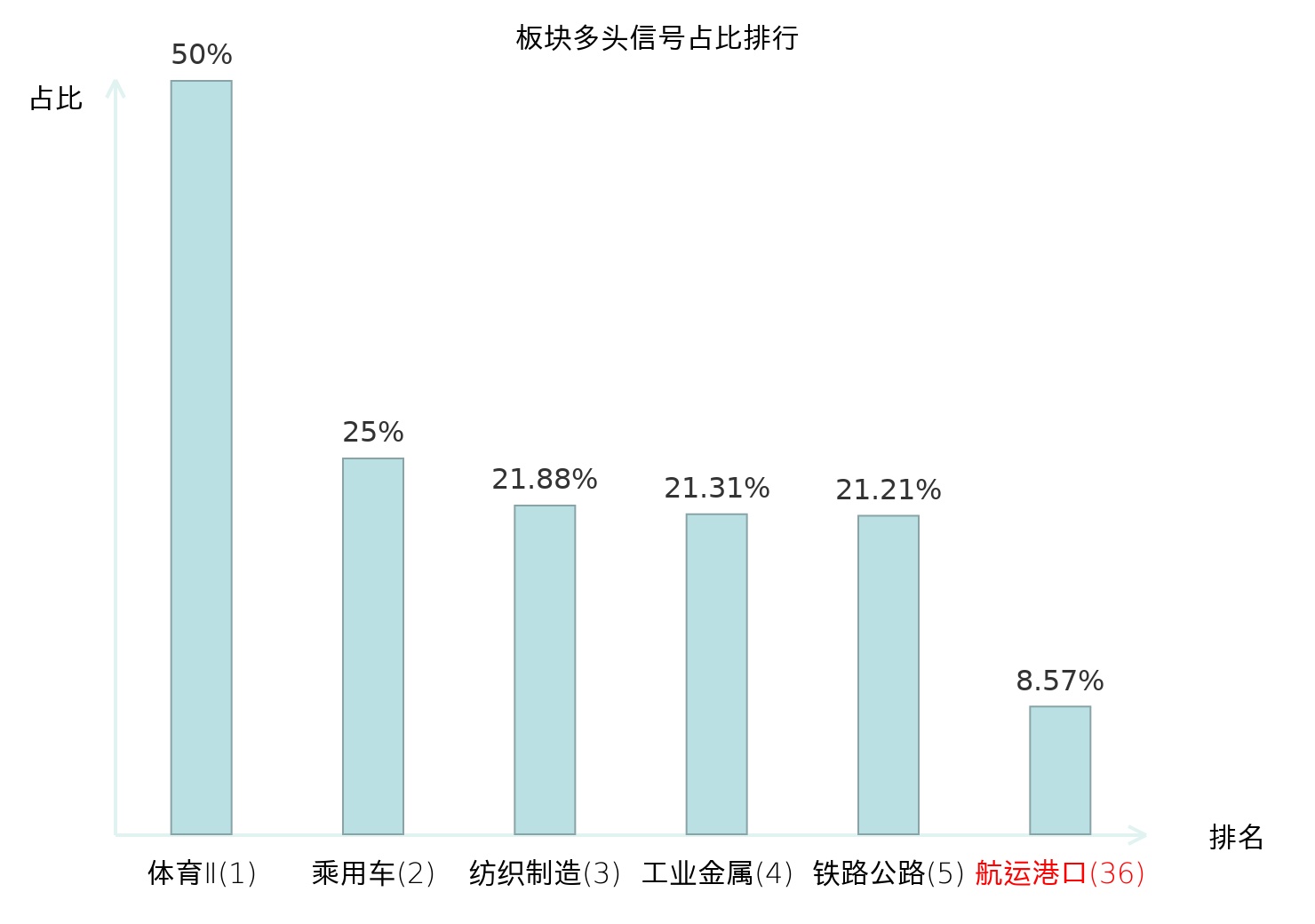 全市场所有行业板块中主力多头信号占比排名中,体育Ⅱ板块位居第一。体育Ⅱ板块名次提升最快,较昨日上升130位。