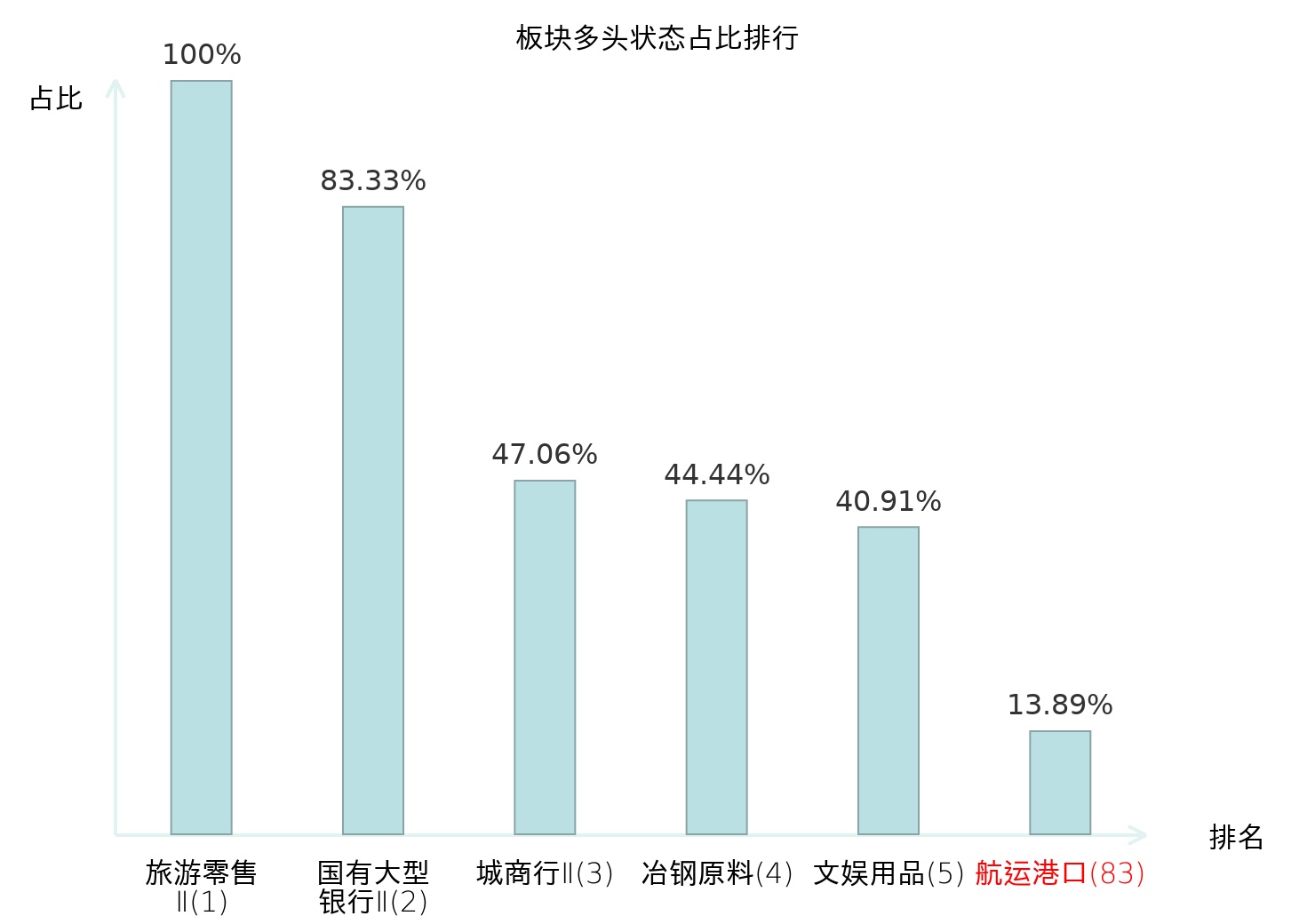 全市场所有行业板块中主力多头状态占比排名中,旅游零售Ⅱ板块位居第一。旅游零售Ⅱ板块名次提升最快,较昨日上升130位。