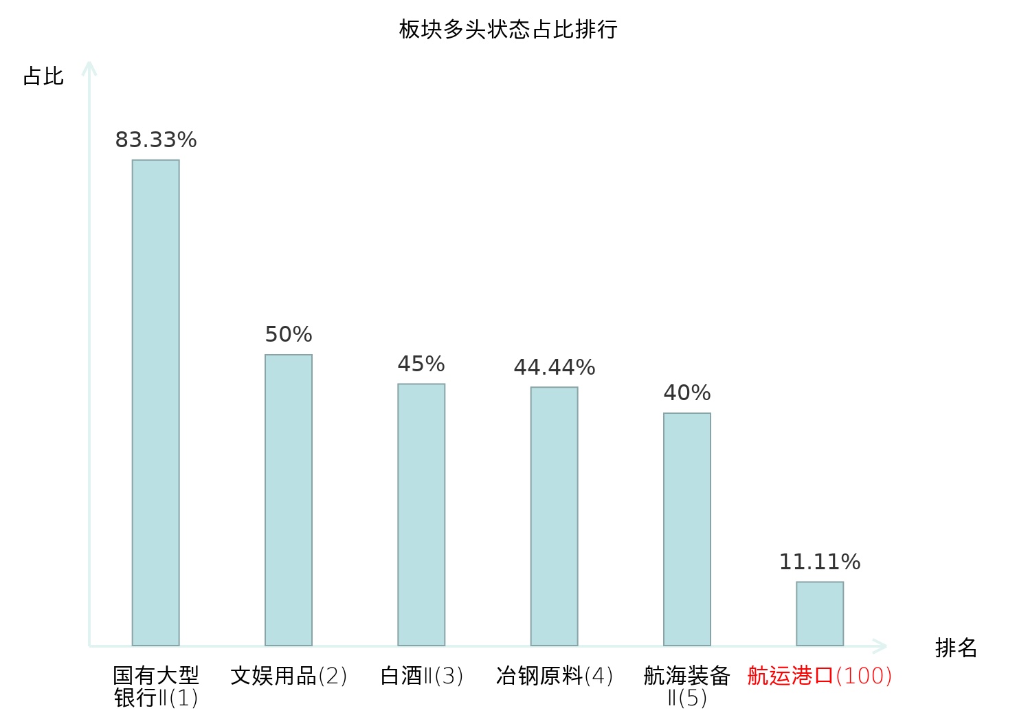 全市场所有行业板块中主力多头状态占比排名中,国有大型银行Ⅱ板块位居第一。其他家电Ⅱ板块名次提升最快,较昨日上升116位。