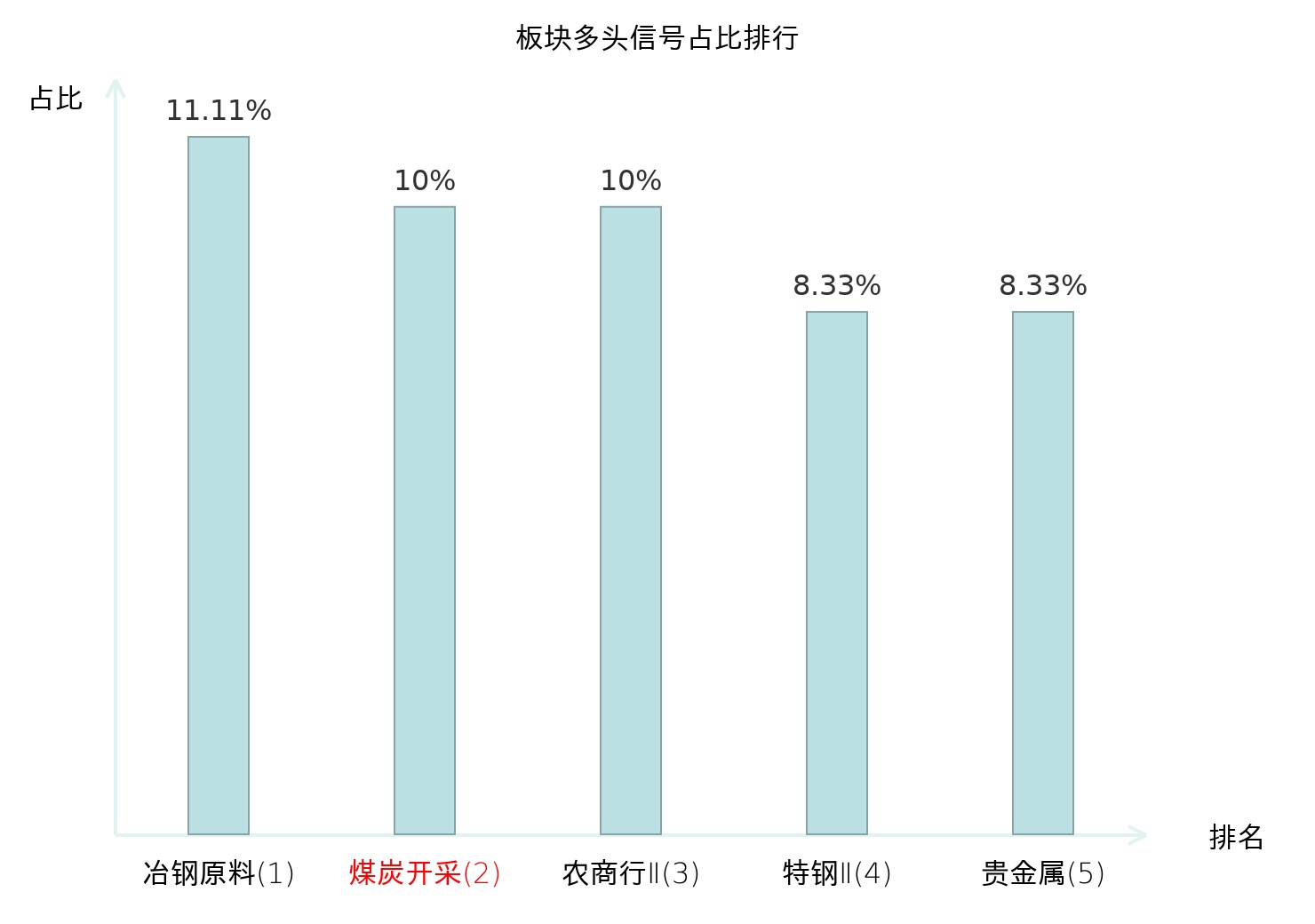 全市场所有行业板块中主力多头信号占比排名中,冶钢原料板块位居第一。冶钢原料板块名次提升最快,较昨日上升117位。