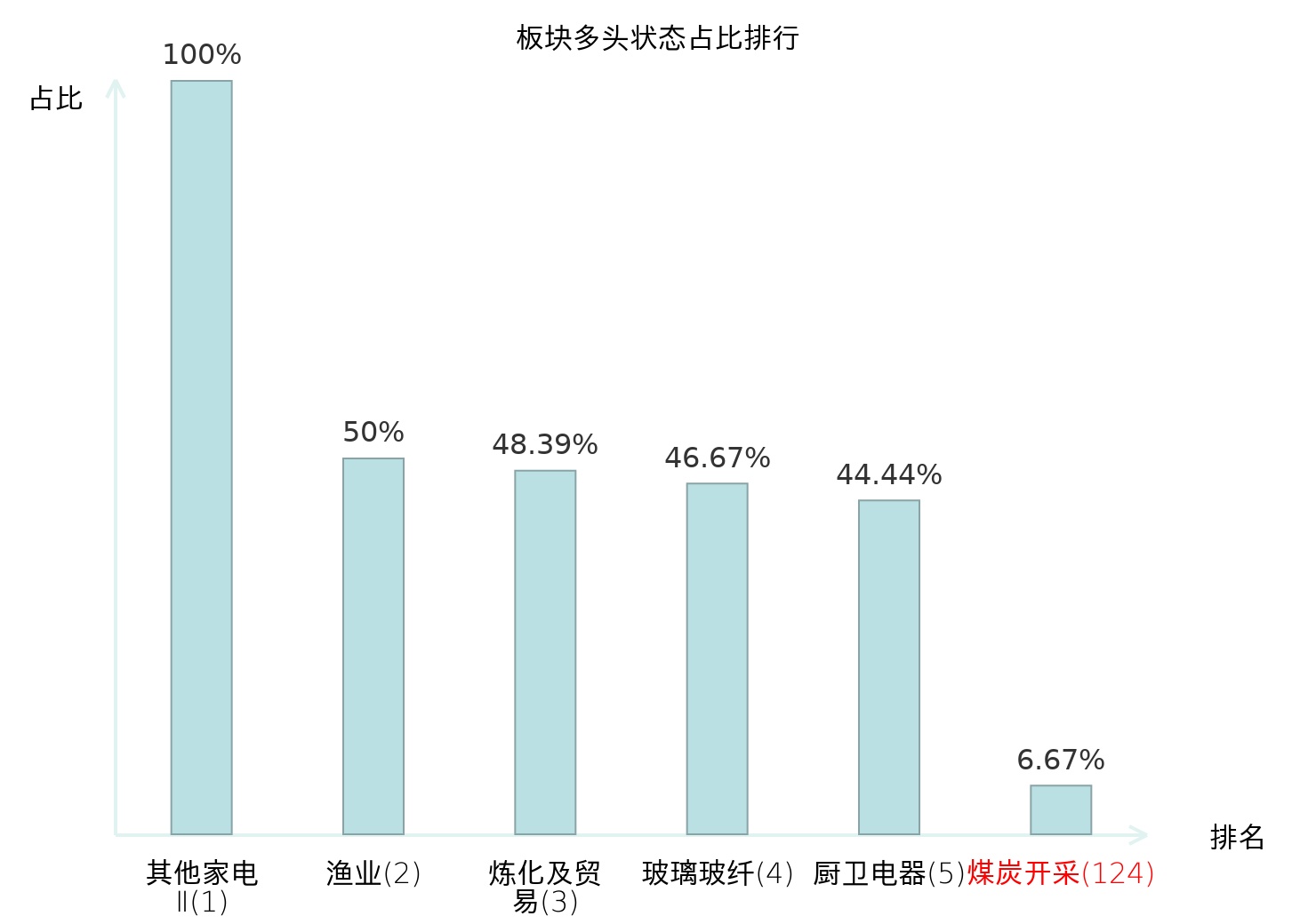 全市场所有行业板块中主力多头状态占比排名中,其他家电Ⅱ板块位居第一。冶钢原料板块名次提升最快,较昨日上升67位。