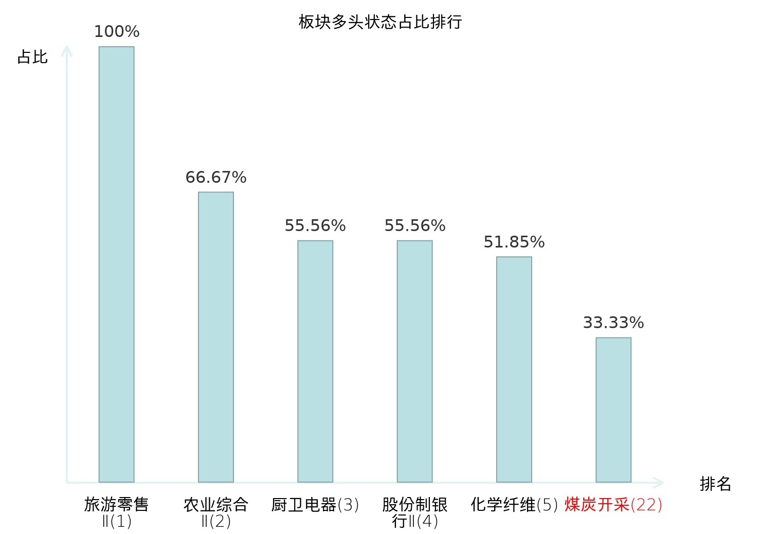 全市场所有行业板块中主力多头状态占比排名中,旅游零售Ⅱ板块位居第一。国有大型银行Ⅱ板块名次提升最快,较昨日上升103位。