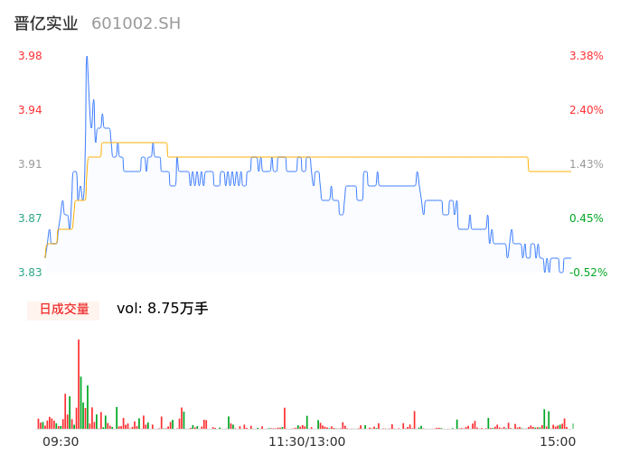 04月12日,晋亿实业收报3.83,股价涨幅-0.52%,成交金额3412.88万元,换手率0.92%。