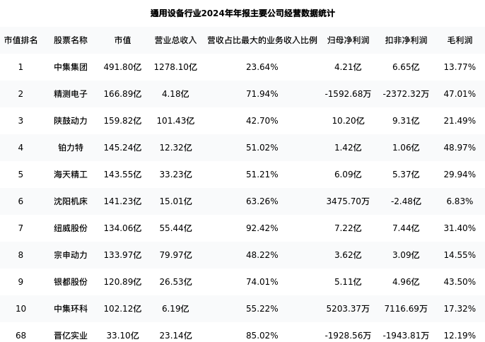 晋亿实业最新报告期数据为年报,下表汇总了通用设备行业内市值靠前的公司年报主要经营数据