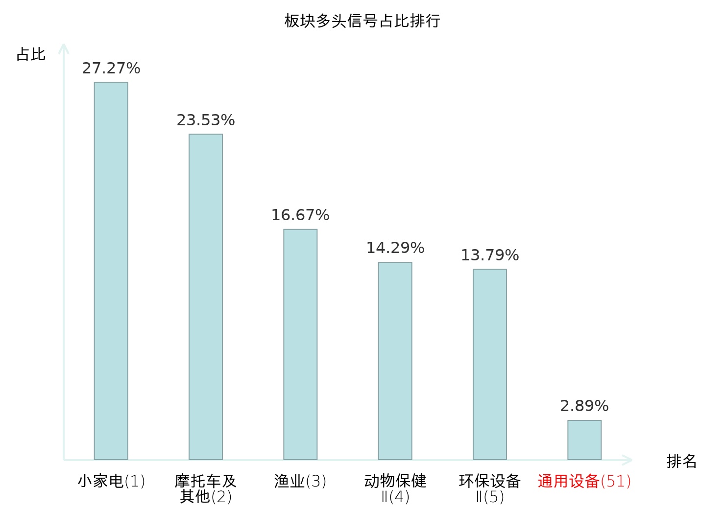 全市场所有行业板块中主力多头信号占比排名中,小家电板块位居第一。渔业板块名次提升最快,较昨日上升122位。