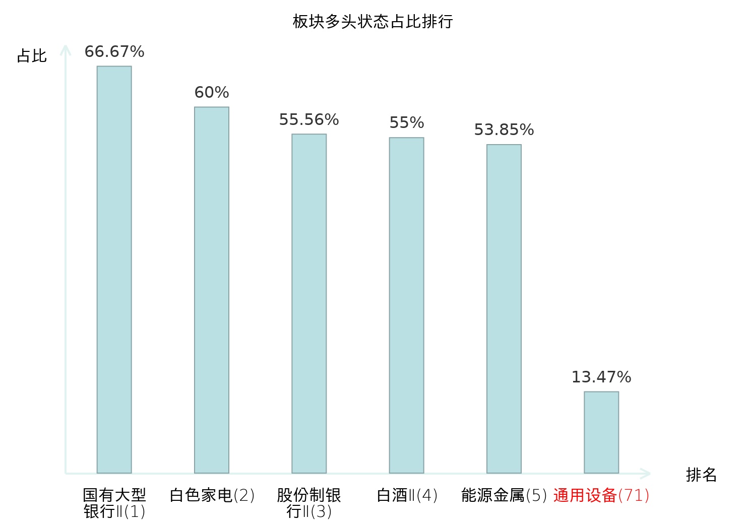 全市场所有行业板块中主力多头状态占比排名中,国有大型银行Ⅱ板块位居第一。林业Ⅱ板块名次提升最快,较昨日上升99位。
