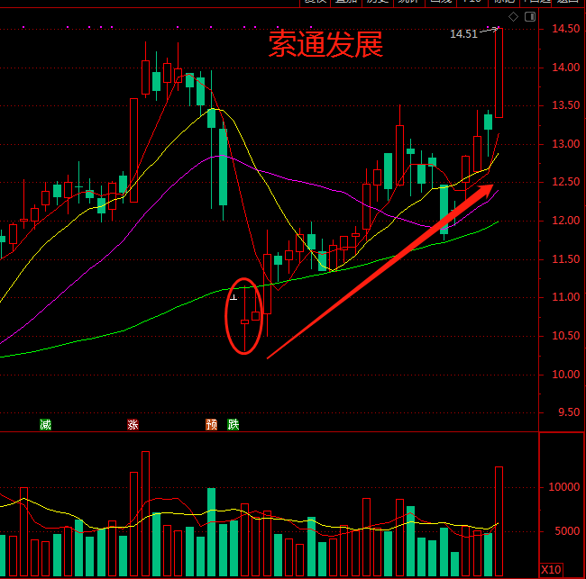 上图索通发展,之前一直在下降通道中,从14块多跌倒了2020年2月4日,当天大盘调整之际,股价也被狠狠打压,但是随后很快反弹起来,全天的跌幅并不大。