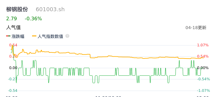 04月18日,柳钢股份收报2.79,股价涨幅-0.36%,成交金额2124.10万元,换手率0.30%。