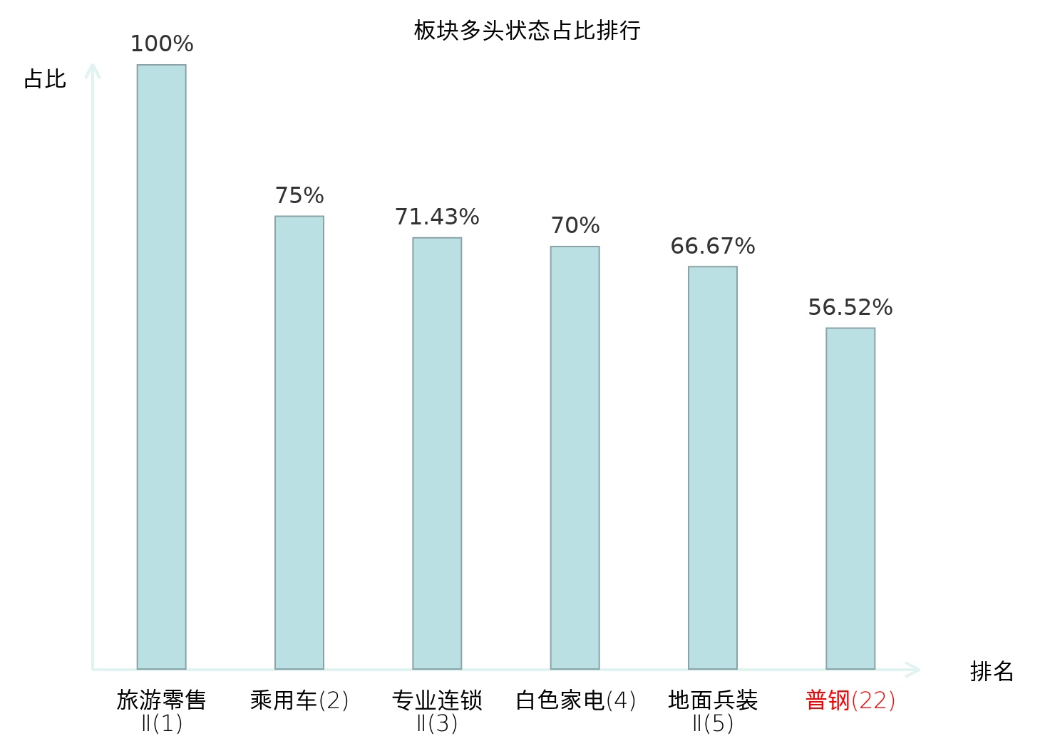 全市场所有行业板块中主力多头状态占比排名中,旅游零售Ⅱ板块位居第一。焦炭Ⅱ板块名次提升最快,较昨日上升105位。