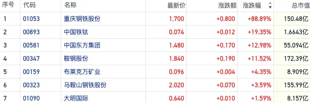 截至发稿,重庆钢铁股份(01053.HK)涨近90%,盘中最高一度飙涨超130%;鞍钢股份(00347.HK)、中国东方集团(00581.HK)均涨逾10%。马鞍山钢铁股份(00323.HK)、大明国际(01090.HK)等公司也均有跟涨。