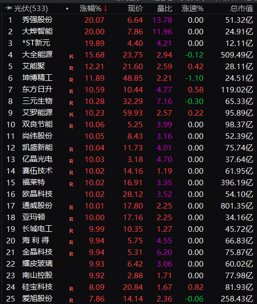 A股市场中,锂矿概念股也出现拉升,西藏矿业一度涨逾8%,西藏珠峰、融捷股份等跟涨。光伏概念股再度走高,截至收盘,秀强股份、大烨智能、*ST新元拿下20cm涨停,大全能源、艾能聚、坤博精工、东方日升、艾罗能源、双良节能、尚纬股份、凯盛新能、赛伍技术、亿晶光电、欧晶科技等20多只股票涨停或涨超10%。