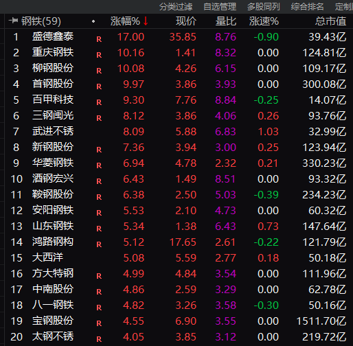 传统板块大爆发的日子。今天午后,港股钢铁板块迎来大批投机资金,重庆钢铁股份一度大涨逾120%,鞍钢股份涨逾30%,马鞍山钢铁股份涨超20%。A股钢铁板块亦全线拉升,板块指数大涨近4%,截至收盘,盛德鑫泰大涨17%,重庆钢铁、柳钢股份、首钢股份涨停。