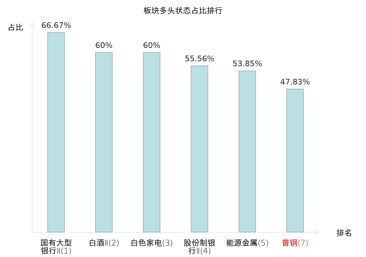 全市场所有行业板块中主力多头状态占比排名中,国有大型银行Ⅱ板块位居第一。电子化学品Ⅱ板块名次提升最快,较昨日上升55位。
