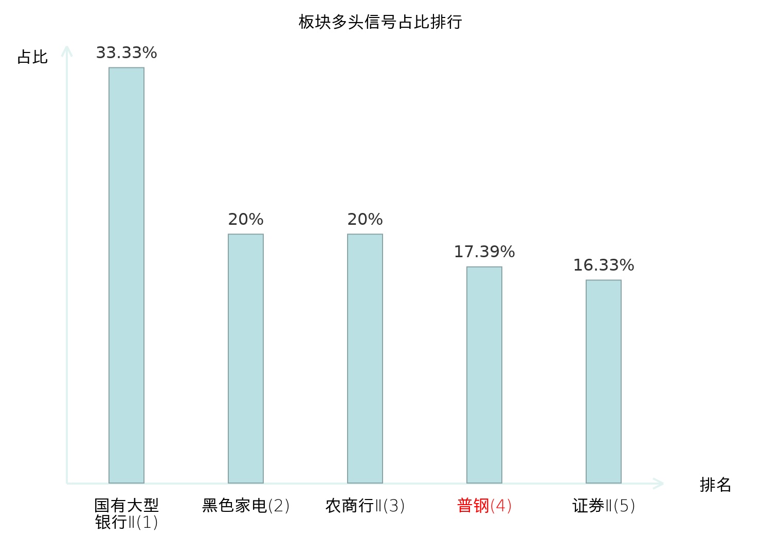 全市场所有行业板块中主力多头信号占比排名中,国有大型银行Ⅱ板块位居第一。国有大型银行Ⅱ板块名次提升最快,较昨日上升123位。