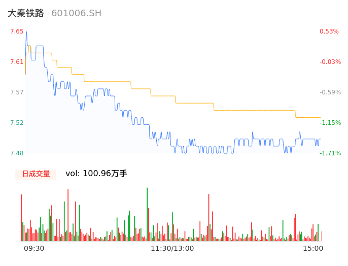 04月22日,大秦铁路收报7.50,股价涨幅-1.45%,成交金额7.60亿元,换手率0.57%。