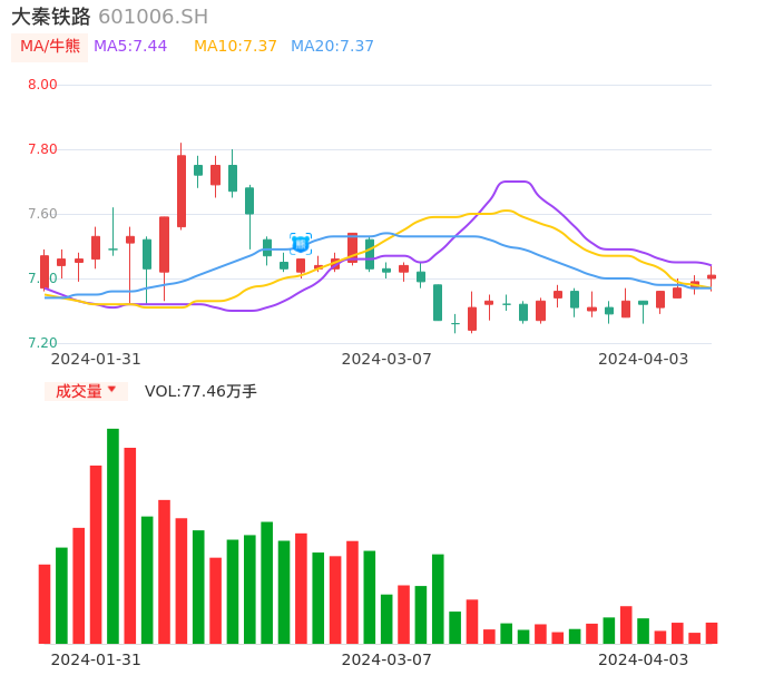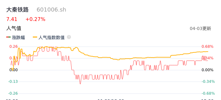 04月03日,大秦铁路收报7.41,股价涨幅0.27%,成交金额5.74亿元,换手率0.44%。