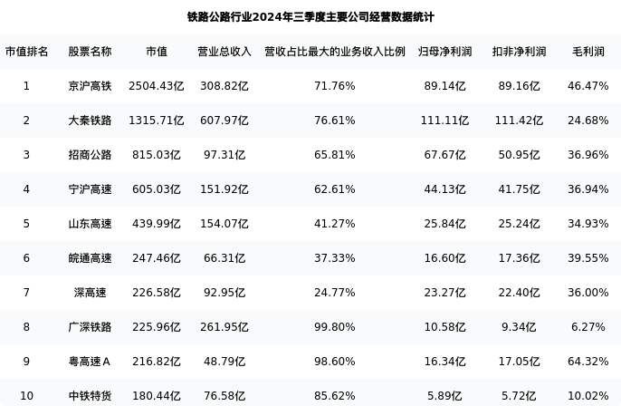 大秦铁路最新报告期数据为三季度,下表汇总了铁路公路行业内市值靠前的公司三季度主要经营数据