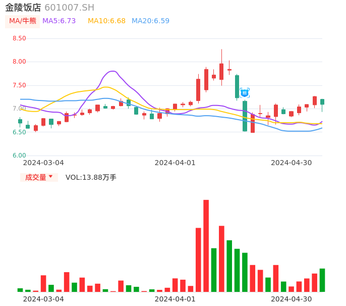04月30日,金陵饭店收报7.09,股价涨幅-2.34%,成交金额9809.94万元,换手率3.56%。