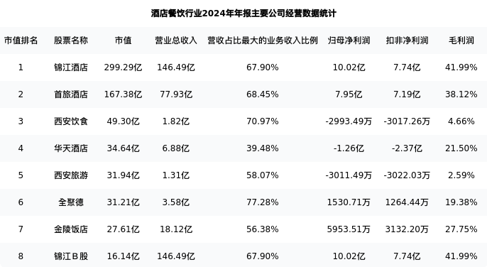 金陵饭店最新报告期数据为年报,下表汇总了酒店餐饮行业内市值靠前的公司年报主要经营数据