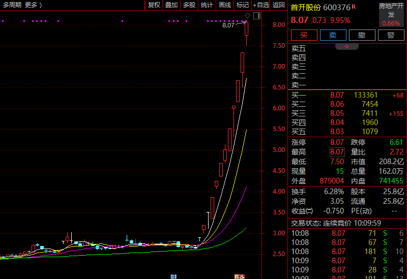 个股方面,首开股份(600376)再度涨停,录得12天11板;山子高科、香江控股5连板。开普股份走出12连板。
