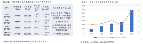 中简科技,公司新一代碳纤维ZT9H产品2023年实现收入1.50亿元。中简科技可生产高强型ZT7系列(高于T700级)、ZT8系列(T800级)、ZT9系列(T1000/T1100级)和高模型ZM40J(M40J级)石墨纤维,其中,ZT7系列碳纤维已经率先稳定批量在航空、航天领域应用多年。ZT9H碳纤维是公司自2015年开始研制的;经过4年的持续自主创新和验证迭代,2019年实现了新一代碳纤维复合材料性能指标的跨代提升,开始了新一代应用的深化研究和验证工作;2023年实现了稳定批产供应,贡献收入1.50亿元,占公司当年营收的27%。