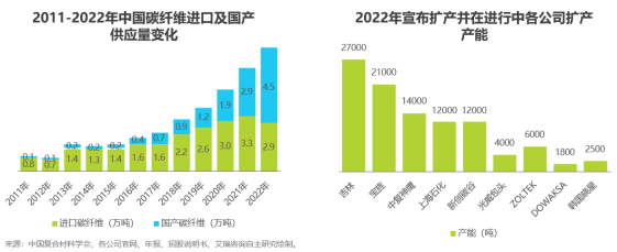 产能扩张:自2017年起,国产碳纤维产能扩张加速,2022年国产供应量首次高于进口量。