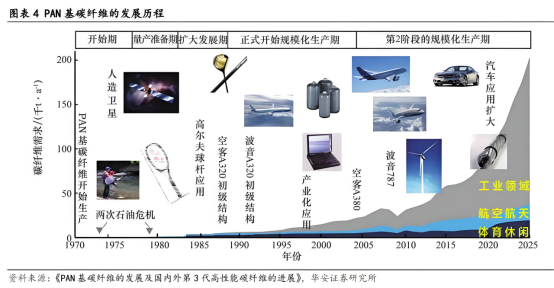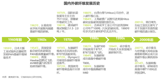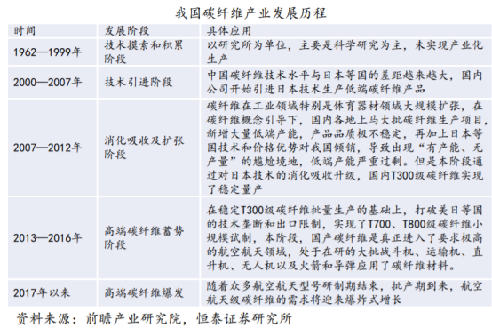 发展历程:中国碳纤维工业经历了长期低水平徘徊、技术转型和快速发展三个阶段,目前国产化取得长足进步。
