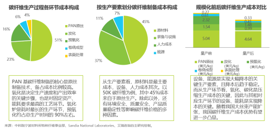 规模效益:通过规模化生产,碳纤维生产成本可大幅降低,如中科院宁波材料所数据显示,生产成本可从9.88美元/kg降至2.03美元/kg。