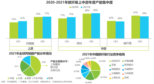 碳纤维上中游行业集中度较高:我国丙烯腈、原丝及碳纤维产能集中度较高,2020年和2021年CR5产能集中度均大于75%。碳纤维生产原料丙烯腈主要集中于上海赛科、斯尔邦、吉林石化等,原丝及碳纤维产能主要集中在吉林化纤中复神鹰、宝旌碳纤维、恒神股份等制造商,资金壁垒与技术壁垒使大量企业难以进入。