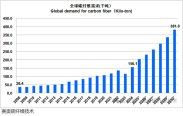 全球碳纤维市场需求:相对2023年的11.5万吨,2024年的全球需求为15.61吨,同比增长了35.7%。