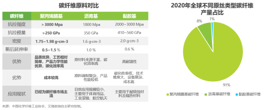 聚丙烯腈基已成为碳纤维市场主流:聚丙烯腈基碳纤维结构性能优越,占据全球90%市场。碳纤维按照原丝类型可分为聚丙烯腈基、沥青基、粘胶基等。其中聚丙烯腈基碳纤维因生产工艺简单、原料来源丰富及优越的结构和功能特性迅速占据市场,2020年全球产量占有率达到91%。黏胶基和沥青基碳纤维用途较单一,产量也较为有限。沥青基碳纤维保持约1000吨年产量,被日、美企业平分秋色;粘胶基碳纤维基本停产,有可能完全退出碳纤维市场。