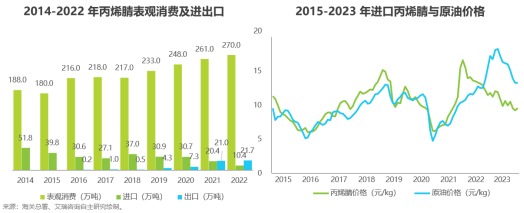 聚丙烯腈国内产能不断释放,出口量逐渐赶超进口。丙烯腈原材料丰富易得,可通过从石油、煤炭、天然气等化石燃料中制备得到。由于国内新增产能不断释放,2014-2022年我国丙烯腈进口量逐年下降,出口量不断上升。2022年丙烯晴表观消费达270万吨,进口为10.4万吨,出口达到21.7万吨。随着山东海江、浙江石化等新产能陆续释放,国内自给率不断提升。从历史价格看,丙烯腈价格基本与原油价格走势相一致,近年来波动幅度明显减弱。此外,随着国内近年来丙烯腈产能释放,国产丙烯腈价格从原来高于进口价逐渐趋近于与进口相一致。