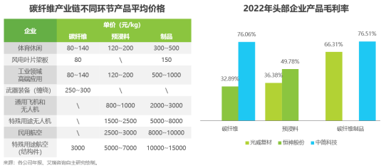 下游碳纤维制品和复合材料附加值更高,如工业领域高端应用的碳纤维制品平均价格为500~1000元/千克,远高于上游碳纤维产品。