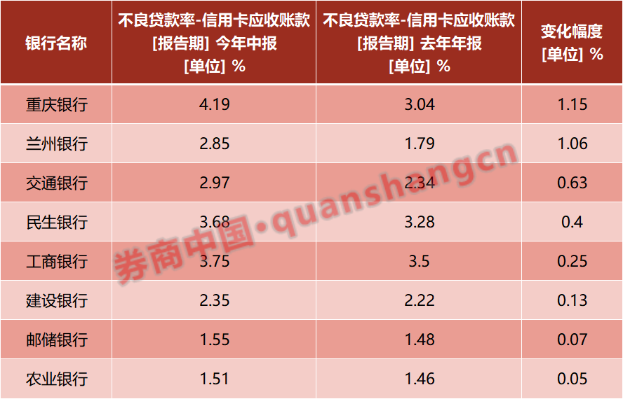 其中,6月末,重庆银行信用卡不良率较年初增加1.15个百分点至4.19%;兰州银行信用卡不良率较年初增加1.06个百分点至2.85%,增幅均超1个百分点。交通银行民生银行工商银行的信用卡不良率分别较年初增加0.63、0.4、0.25个百分点至2.97%、3.68%、3.75%。