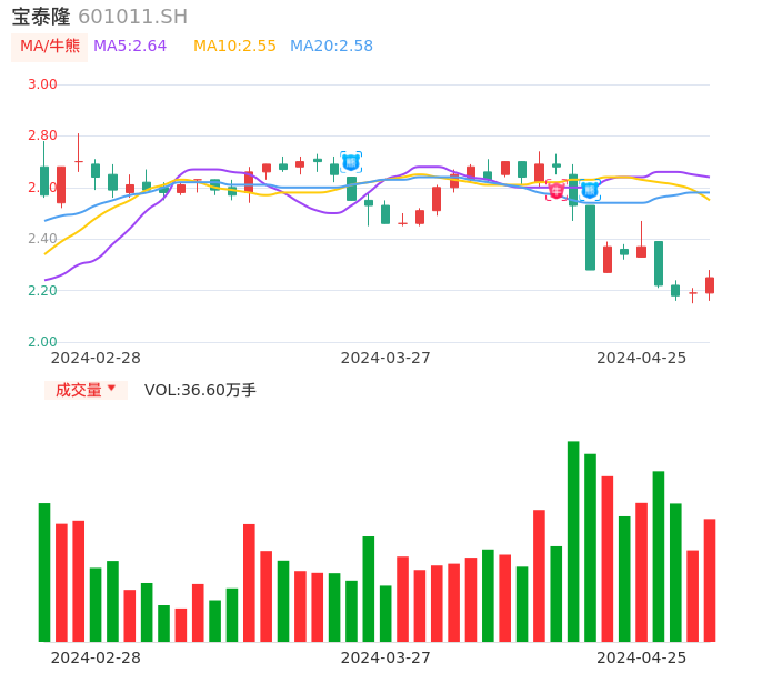 宝泰隆在4月16日出现日线级别熊点,虽然60分钟处于牛点区间,在未有效突破上方长阴死叉K线组合压力位:2.73元前需要谨慎观望。