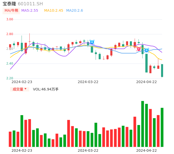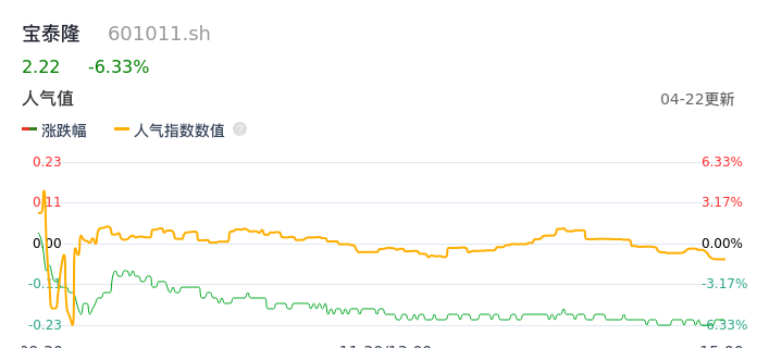 04月22日,宝泰隆收报2.22,股价涨幅-6.33%,成交金额1.06亿元,换手率2.45%。