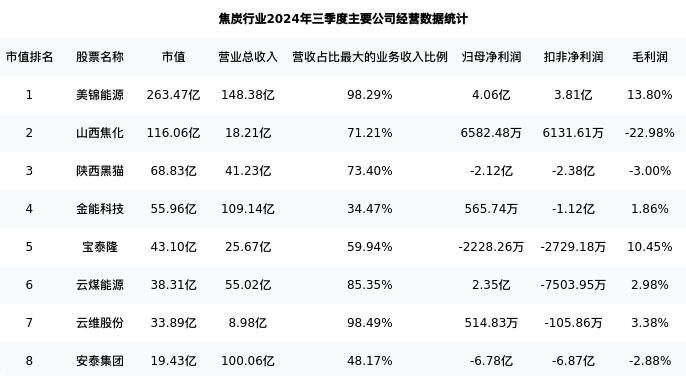 宝泰隆最新报告期数据为三季度,下表汇总了焦炭行业内市值靠前的公司三季度主要经营数据