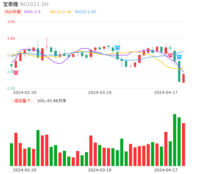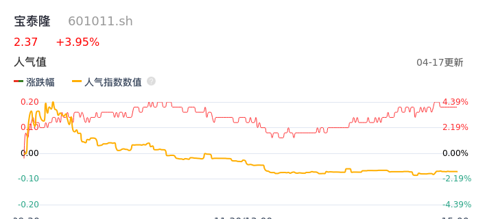 04月17日,宝泰隆收报2.37,股价涨幅3.95%,成交金额1.08亿元,换手率2.39%。