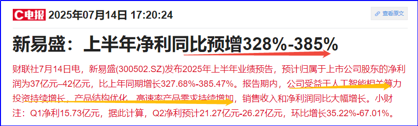 CPO三杰之一的新易盛公布了炸裂的中报预告,早盘跳空高开后20CM涨停,市值突破1500亿,短短3个多月,股价从最低的46.56一波上涨至今天的157.08,另外二杰中际旭创、天孚通信今天涨幅也是超过10%,股价处于历史新高附近。