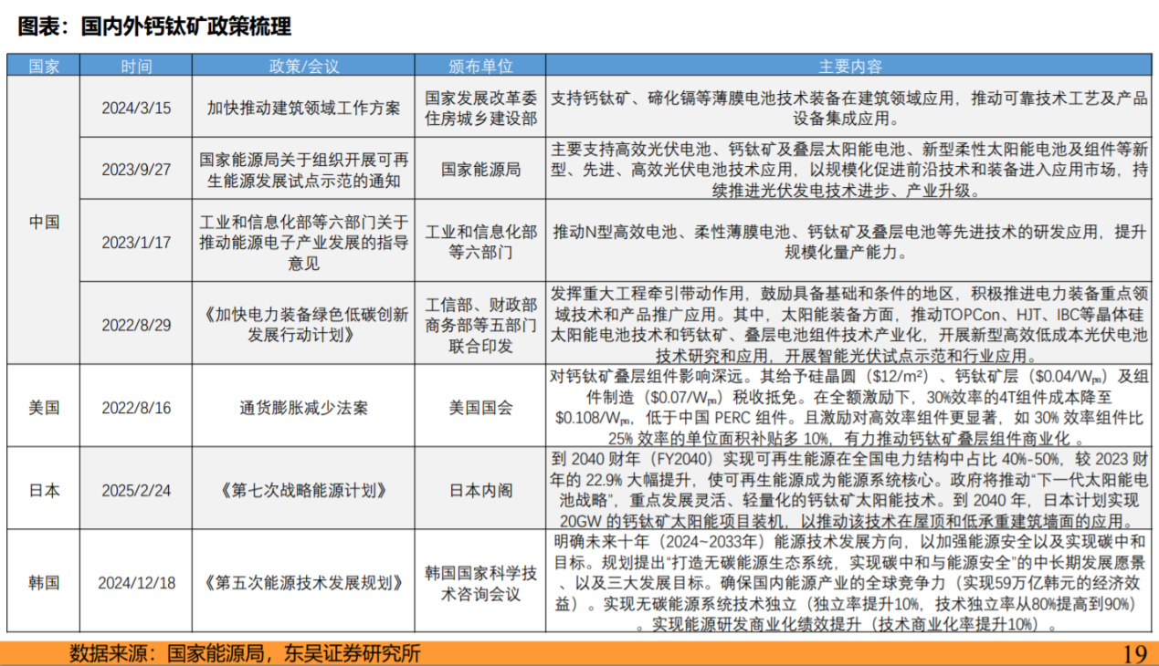 4.钙钛矿电池技术目前已经进入到产业化阶段。国家及地方政府产业政策持续推动。从政策导向上来看,2024年从“鼓励研发”转向“规模化落地”,通过技术标准、场景试点、区域协同三管齐下,推动钙钛矿从实验室迈向产业化快车道。