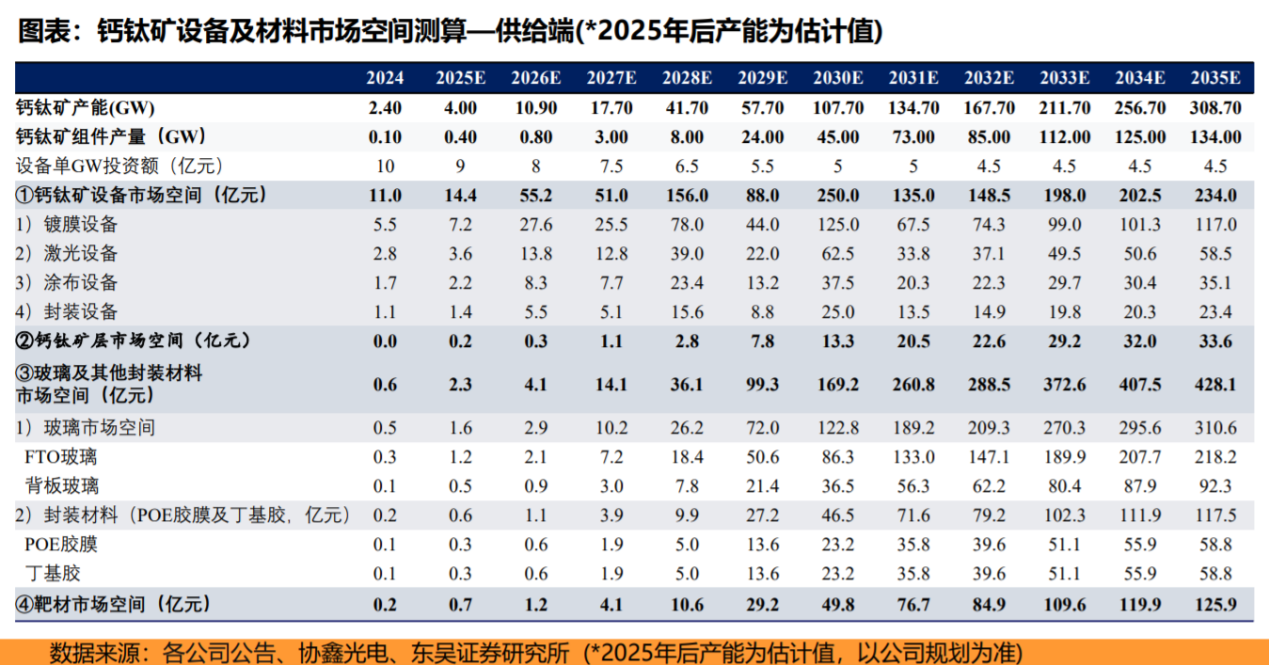 后续GW级设备投资预计约7-10亿元/GW。预计钙钛矿产能2030年有望达百GW+,组件市场近400亿,设备逐步受益。