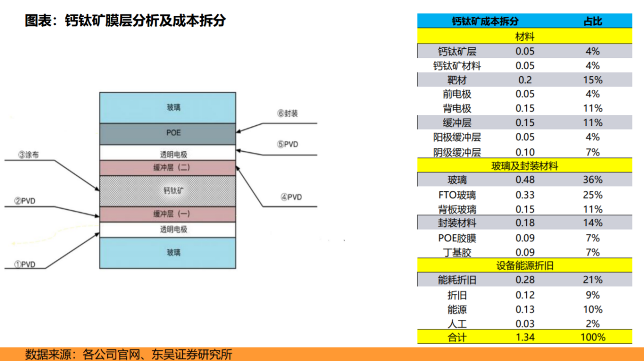 钙钛矿工艺流程较短,易于扩大生产。当前百MW量产成本约1-1.5元/W,玻璃等封装材料占比30%+;预计GW级有望降至8毛/W以内。
